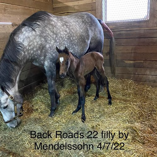 Mendelssohn Filly Out Of Back Roads FILLY, FOALED APRIL 7, 2022 ( MENDELSSOHN – BACK ROADS, BY LIAM’S MAP ) Current Offerings Other Horses Belliqueux Pioneering Spirit Unlimitedpotential Twelth Man